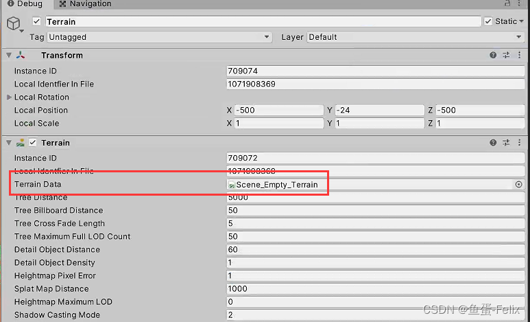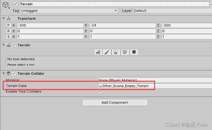 - 我们能看到Terrain Data参数暴露出来了,将正确的Terrain Data拖过去替换即可