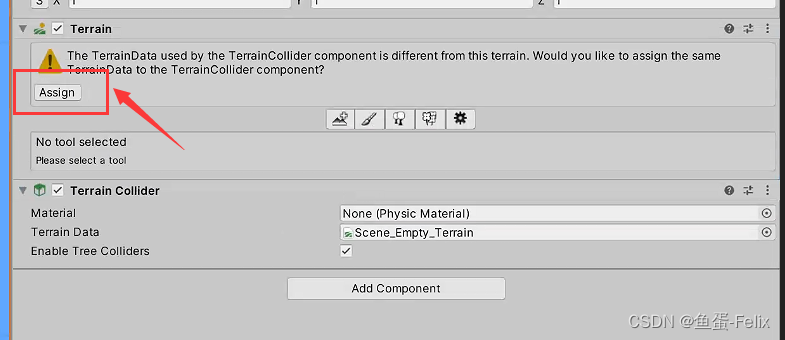 我们发现,强制拖过去会有一个警告,意思大概是地形数据和该地形的collider数据不匹配。而在Terrain的Inspector界面并没有找到任何的关联Terrain Data的地方。