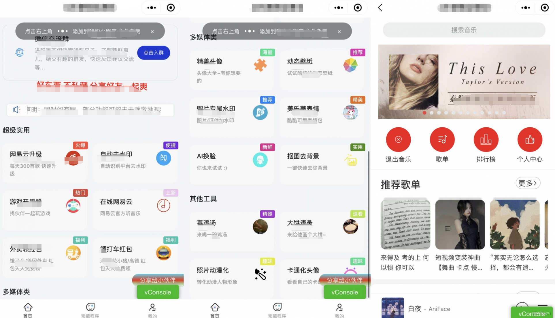 正文: 这是一个多娱乐功能的小程序,程序非常强大,大家自行去体验哈。 具体由以下功能组合: 网易云在线音乐(在线播放音乐和网易云功能界面一样) 外卖CPS(外卖平台优惠劵) 打车CPS(打车平台优惠劵) 头像功能(多分类头像,另外还支持姓氏头像制作) 图片加水印 表情包功能 短视频AI换脸 图片抠图 毒鸡汤 经典语录 照片转漫画 卡通形象制作 等等具体大家自行研究哟 另外该款小程序还拥有小程序扩展推荐等! 程序: wwwu.lanzouw.com/ix3gX05cjf5..