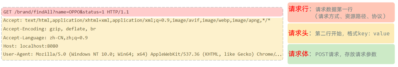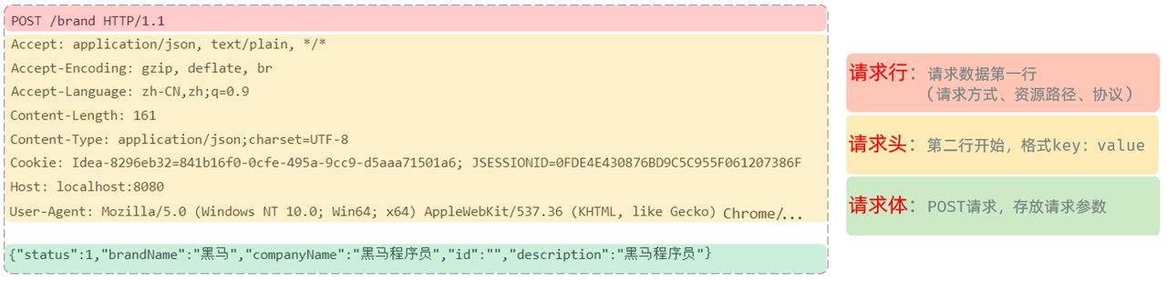 - 请求体 :存储请求参数,GET请求的请求参数在请求行中,故不需要设置请求体。