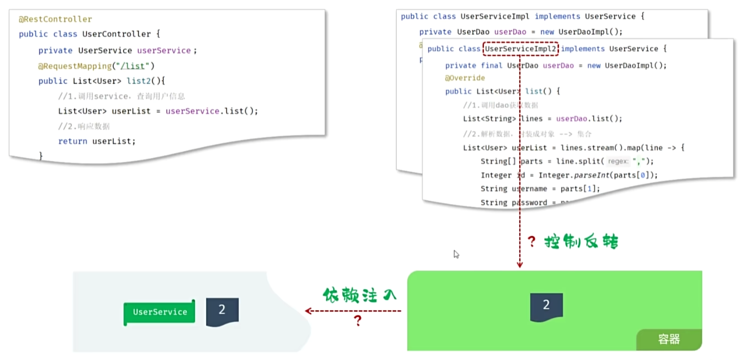 我们需要切换为 UserServiceImpl2 这套实现,就需要修改Contorller的代码,但其实换的是Service层的实现,那此处就会发生层与层耦合。