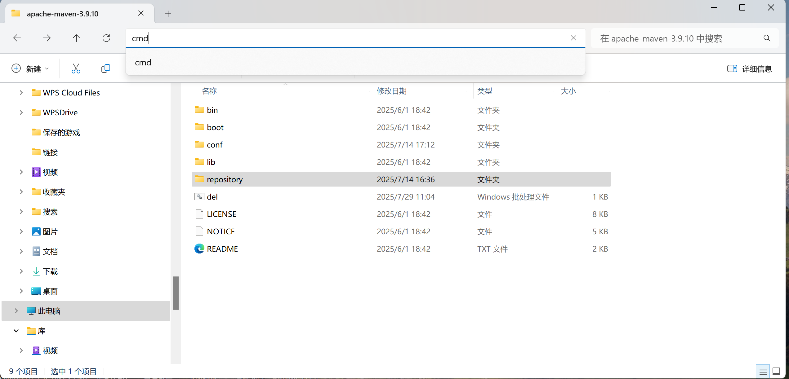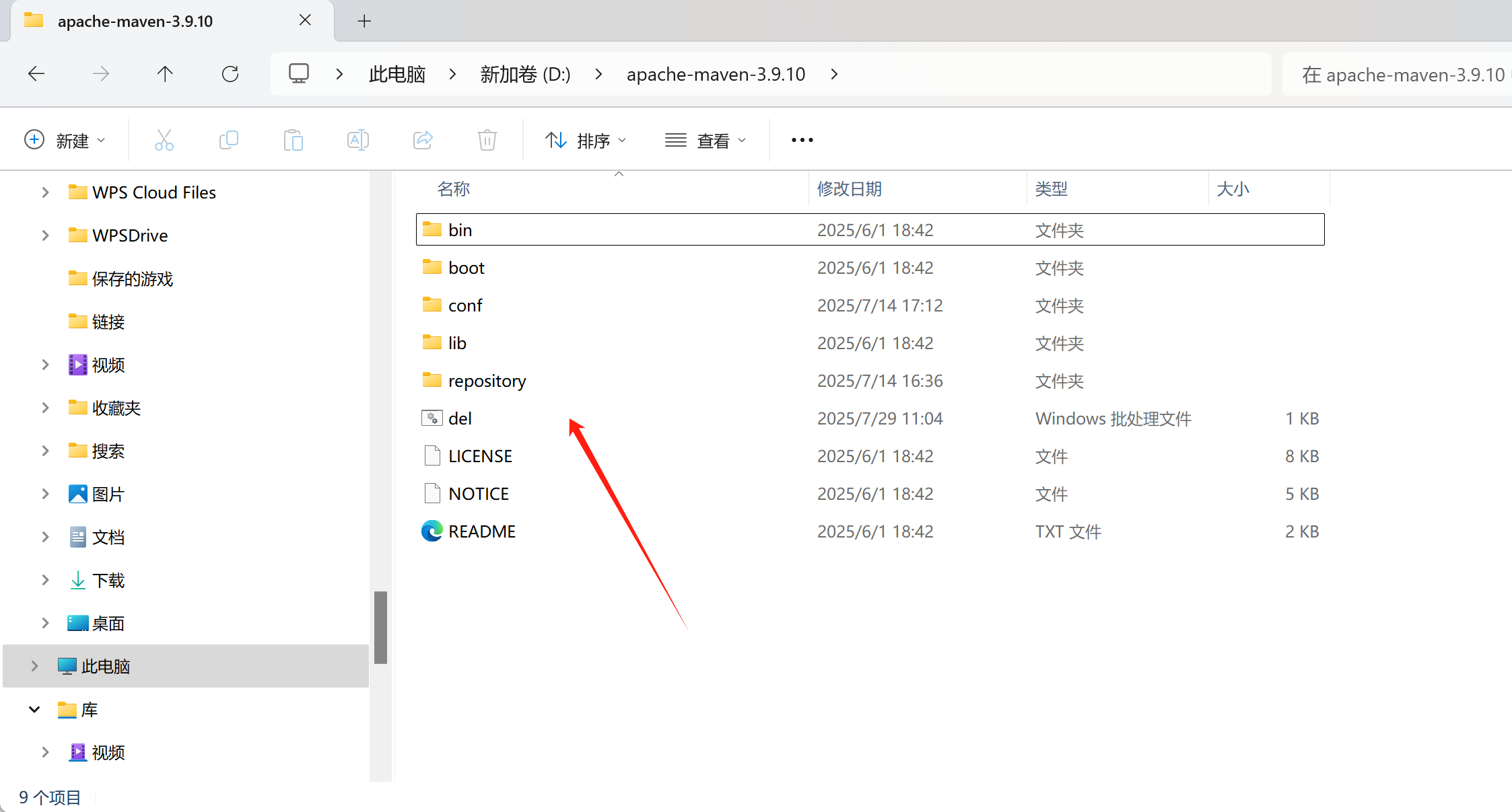 4.del.bat 批处理脚本,拷贝到maven的安装目录下。 双击这个文件,就可以递归删除该目录下所有的.lastUpdated 文件。 放置目录如下所示: