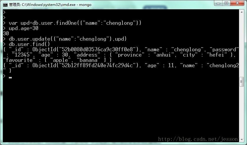 var upd=db.user.findOne({"name":"chenglong"})