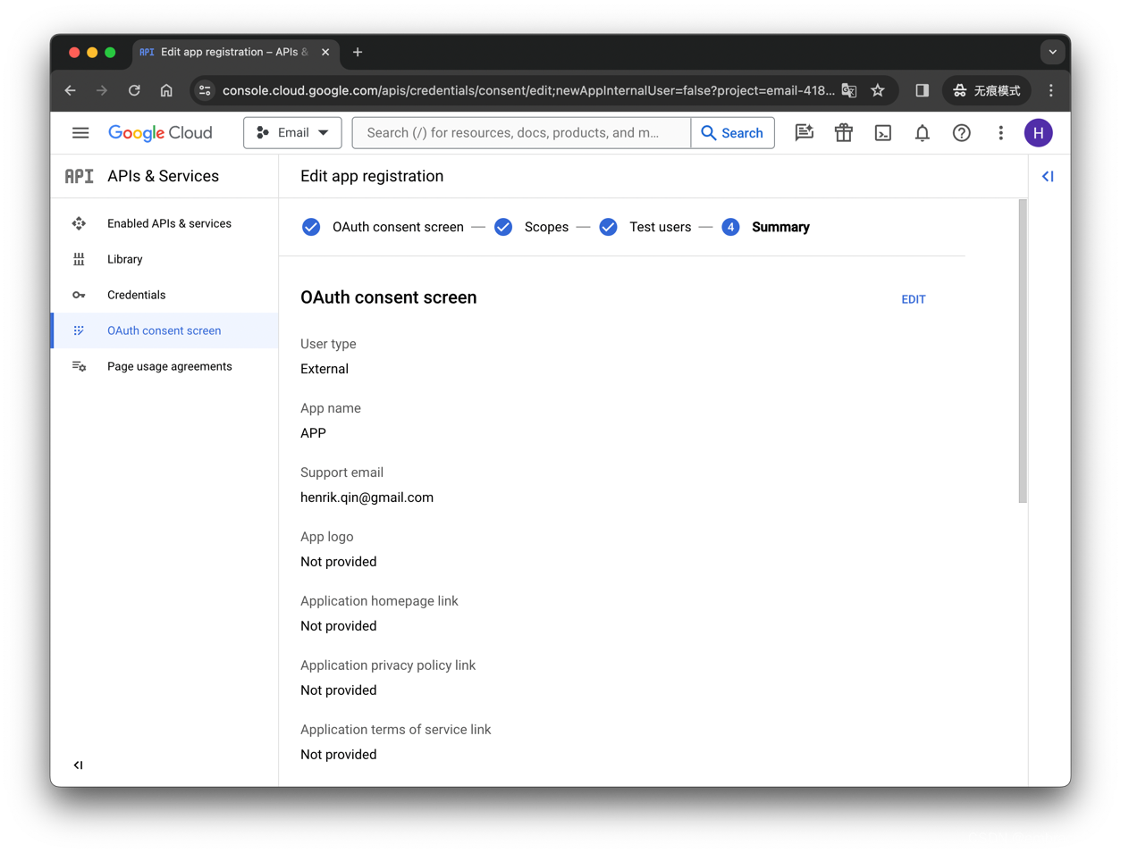 注: 开启后初始状态为Testing,测试完毕后需要点击PUBLISH APP来发布。由于Gmail属于用户敏感信息,必须向Google提交申请才能用于生产环境。如果仅仅是个人使用,保持Testing状态即可。