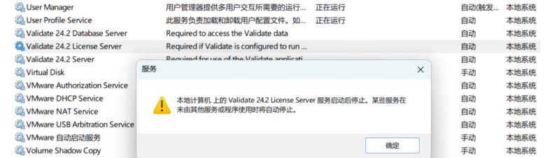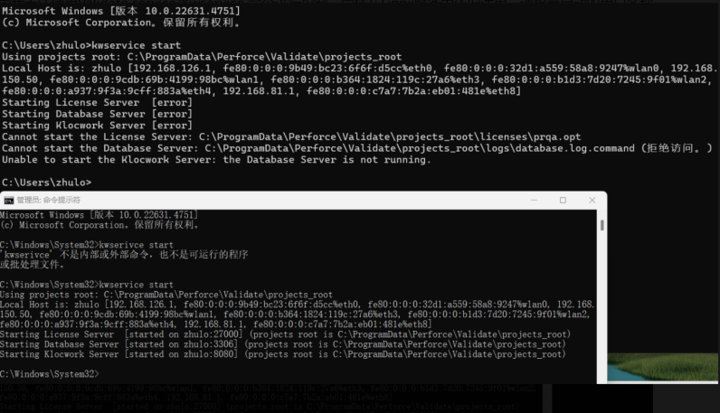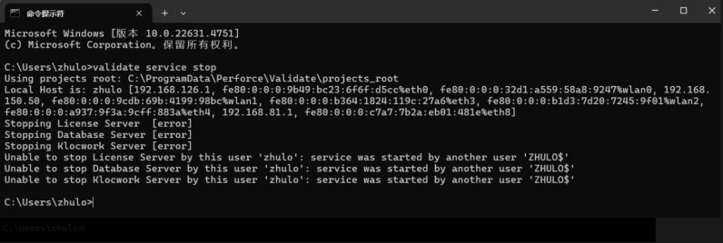 1)、Validate创建了Windows服务并且服务启动方式默认为本地用户,在案例中我的本地用户名为ZHULO$,但是在命令行中本例的用户名称为zhulo。由于不同用户控制,导致默认使用Windows服务启动的服务,在命令行中我无法使用Validate service/Kwservice 命令进行控制。同样在Linnx服务中依旧适用,请检查启动的用户名称和后续操作的用户名称是否一致。