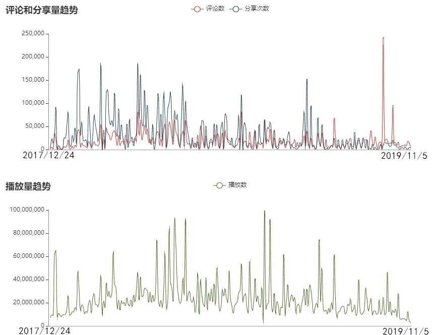 而抖音数据,除了转发量之外,评论、分享、播放、点击数据,因为其独特的推送机制,前后差异并没有微博显著。
