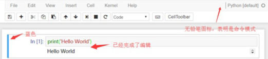 在命令模式(Command Mode)下,铅笔图标消失,单元左侧边框线呈现蓝色,按Enter键或者双击cell变为编辑状态。