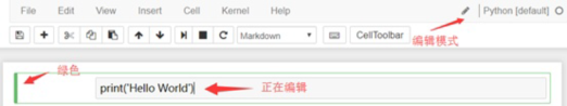 在编辑模式(Edit Mode)下,右上角出现一只铅笔的图标,单元左侧边框线呈现出绿色,点Esc键或运行单元格(ctrl-enter)切换回命令模式。