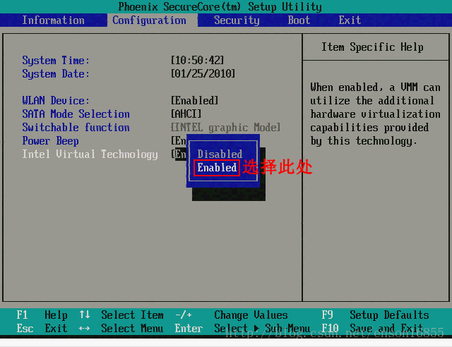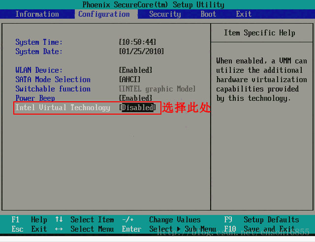 首先在开机自检Logo处按F2热键进入BIOS,选择Configuration选项,选择Intel Virtual Technology并回车,如下图: