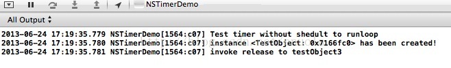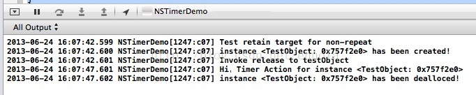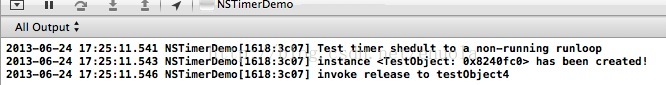 上面的简单例子中,我们自定义了一个继承自NSObject的类TestObject,在这个类的init,dealloc和它的timerAction三个方法中分别打印信息。然后在appDelegate中分别测试一个单次执行的timer和一个重复执行的timer对方法接受者是否做了retain操作,因此我们在两种情况下都是shedule完timer之后立马对该测试对象执行release操作。