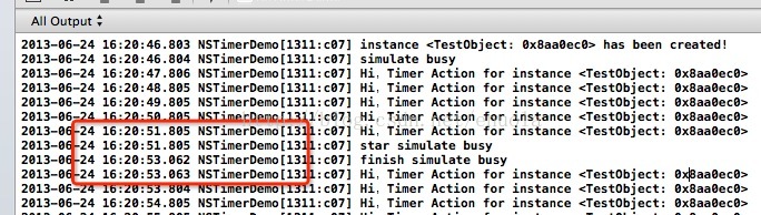 例子中首先开启了一个timer,这个timer每隔1秒调用一次target的timerAction方法,紧接着我们在3秒后调用了一个模拟线程繁忙的方法(其实就是一个大的循环)。运行程序后输出结果如下:
