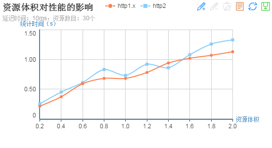 通过上两个实验,可以知道在延迟为10ms,资源数目为30个的时候,http1.x和http2的时间统计相近,故本次实验延迟时间设置为10ms,资源数目30个。