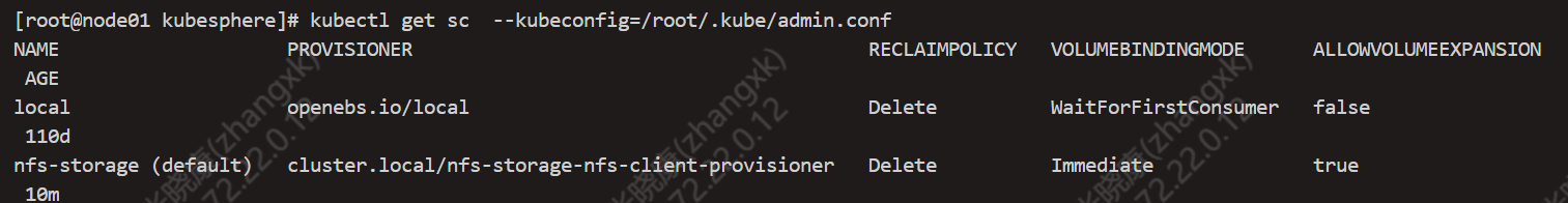 helm install nfs-storage azure/nfs-client-provisioner --set nfs.server=172.22.0.12 --set nfs.path=/data/nfs --set storageClass.name=nfs-storage --set storageClass.defaultClass=true --kubeconfig=/root/.kube/admin.conf
