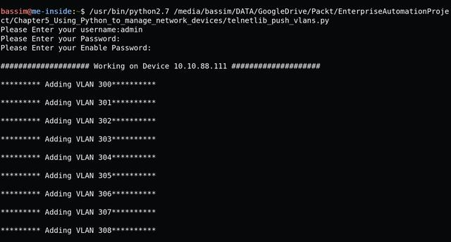 首先,建立到路由器的Telnet连接并输入相应的用户信息,一直到打开特权(enable)模式。然后,创建一个始终为true的无限while循环,使用内置的raw_input()函数捕捉用户输入的命令。脚本捕获到用户输入之后,在网络设备上执行这些命令。
