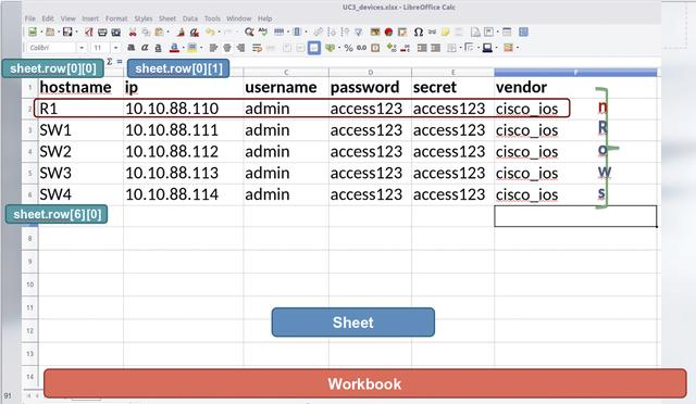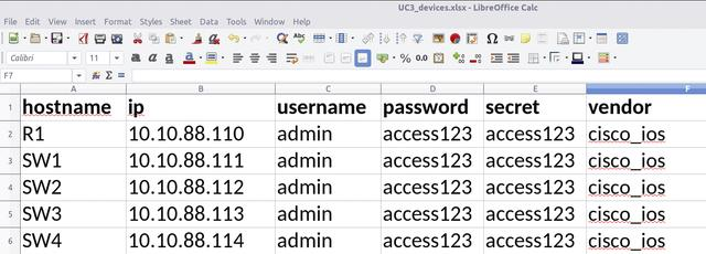 在这个用例中,我们将使用Excel Read(xlrd)模块读取UC3_devices.xlsx文件。该文件保存了基础设施的主机名、IP地址、用户名、普通密码、特权模式下的密码和供应商名称。然后将读到的数据用作netmiko模块的输入。