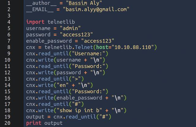 在Python或其他编程活动中,你就是自己的设备供应商。为了满足自己的需求,你可以创建任何喜欢的代码组合和程序。在第二个例子中我们创建自己的终端(terminal),通过telnetlib访问路由器。只需要在终端写几个单词,就会在网络设备中执行很多命令并返回输出结果。输出结果将会显示在标准输出或保存在文件中。