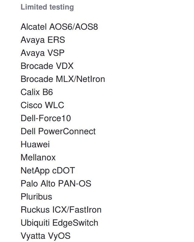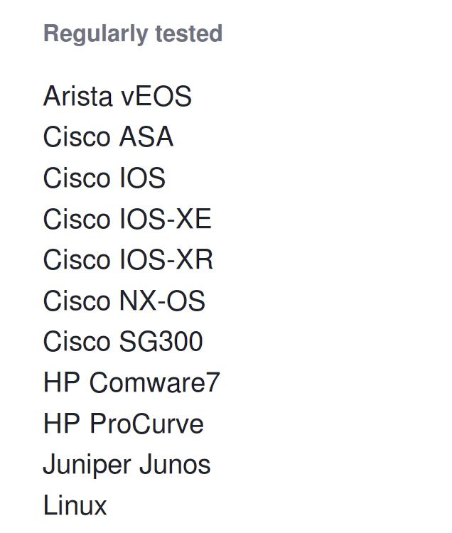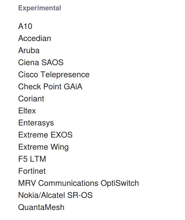 netmiko支持许多供应商的设备,并定期在支持列表中添加新的供应商。netmiko支持的供应商列表分为定期测试类、有限测试类和实验类。在该模块的GitHub页面上可以找到这个列表。