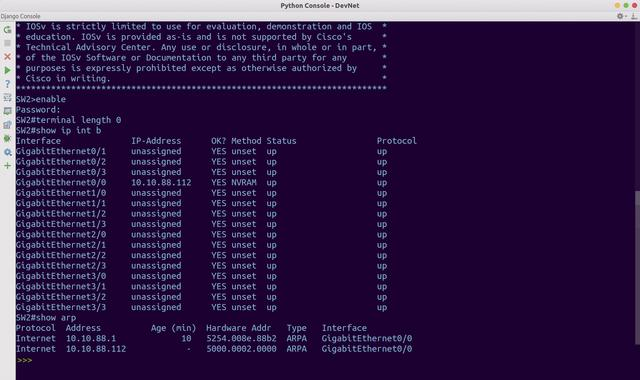 最后一步,把各种命令(如show ip int b和show arp)发送到设备终端,并将返回结果输出到Python窗口中。