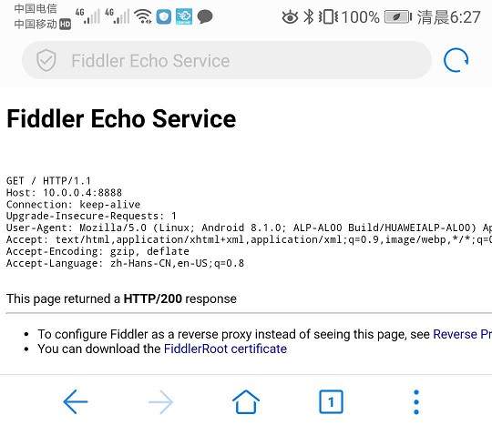 只有Fiddler证书网站能打开,才能说明手机和计算机的网络是通的。再去修改手机上的代理设置,Fiddler才能对App进行抓包。