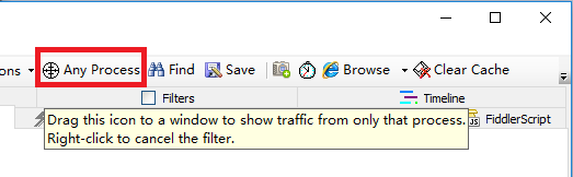 在状态栏中选择Web Browsers或者Non-Browser来选择进程,如图2-21所示。此外,工具栏中还有个按钮:Any Process,单击这个按钮把十字图标拖曳到想要抓包的程序上面,就只会抓特定进程的包,如图2-22所示。
