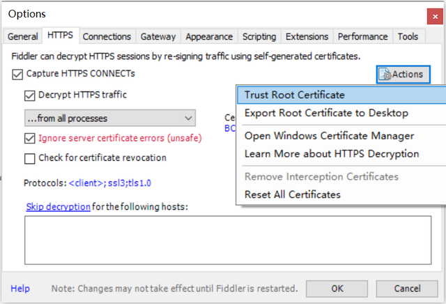重新安装证书的操作是Options→Actions→Trust Root Certificate。