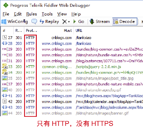 如果证书没有安装成功,那么Fiddler只能抓到HTTP请求,抓不到HTTPS请求,如图2-2所示。所以一定要想办法把证书安装好。