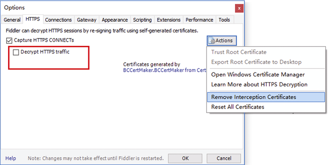 第1步:在Fiddler中删除证书。打开Fiddler,依次打开Tools→Options,取消选中Decrypt HTTP traffic,并且在Actions中单击“Remove Interception Certificates”,如图2-15所示。