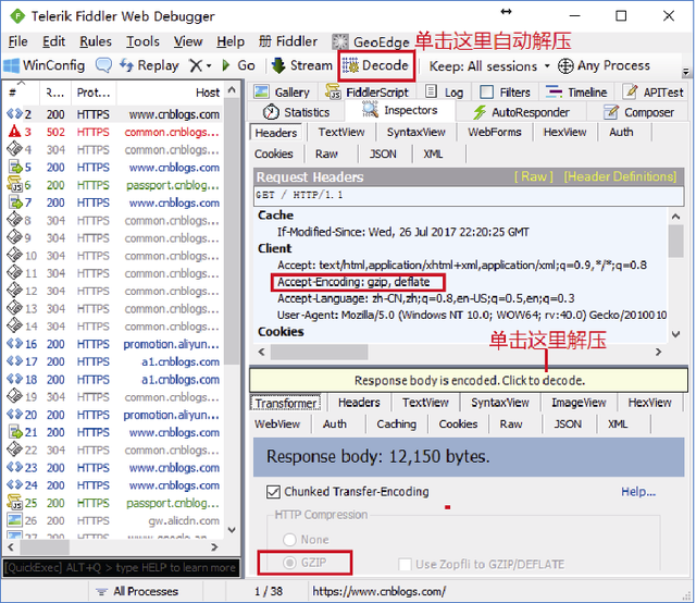 在Fiddler工具栏中选中“Decode”按钮,如图2-3所示。这样就会自动解压HTTP响应,否则我们看到的HTTP响应是乱码。