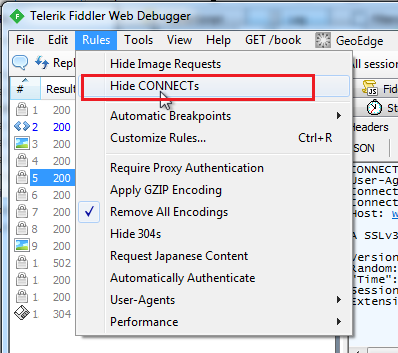 可以在Fiddler中隐藏“CONNECT Tunnels”请求,如图2-4所示。隐藏的方法是选择菜单栏中的Rules→Hide CONNECTs。这样Fiddler就不会捕获大量无用的握手验证请求,如图2-5所示。这些“Tunnel to”的请求对我们没什么用处。因为我们平常根本不关心HTTPS是如何建立连接的。我们抓包是为了看HTTP请求和响应的数据内容,抓HTTPS也是看数据内容,而不关心HTTPS的通信是怎么建立的。