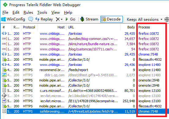 进程是计算机中程序的一次运行活动。Fiddler的Process列对应本地Windows进程。通过这一列我们可以知道是哪个进程在发包,如图2-24所示。