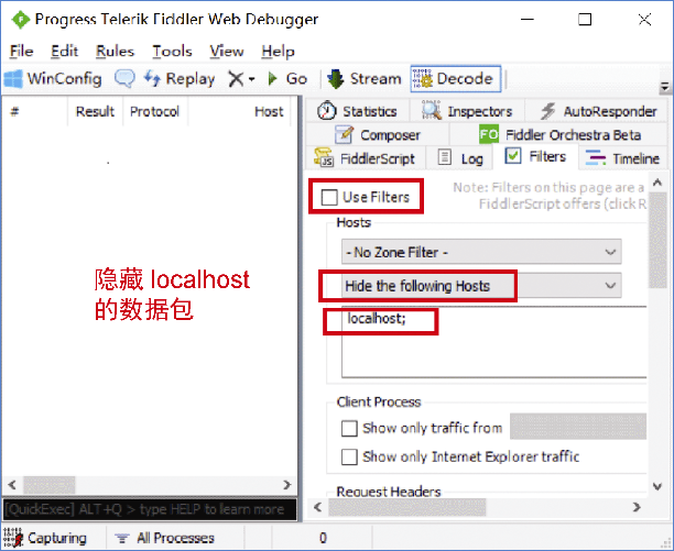 Fiddler有非常强大的过滤会话的功能,假如不想看到localhost的数据包,就可以把它隐藏。过滤的设置如图2-20所示。注意,在设置时两个Host之间要用分号隔开。