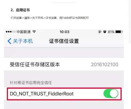 若iOS系统版本是10.3以上,那么证书可能没有被信任,需要手动设置信任证书。依次打开设置→通用→关于本机→证书信任设置,将Fiddler证书启用即可,如图2-17所示。