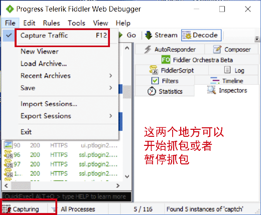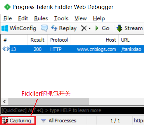 Fiddler有一个抓包的开关。打开状态栏的时候,状态栏的最左边有个“Capturing”图标,如图2-8所示。如果没有这个图标,当然抓不到包了。初学者很容易忘记这个开关。