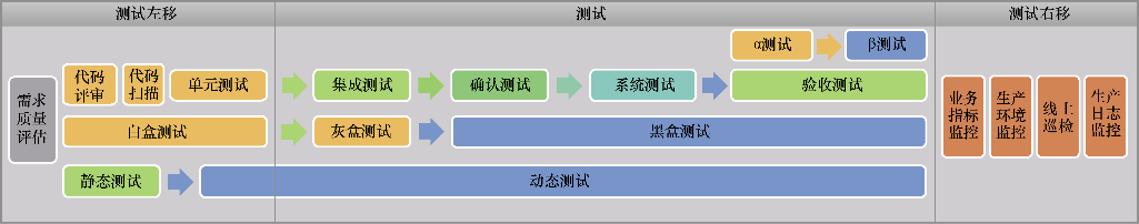 相对于测试左移,测试右移指产品发布上线或者交付客户后的一些与质量相关的活动,从而保障业务的连续性,提升交付后的产品质量。这里的质量活动包含生产环境监控、生产日志监控、线上巡检、业务指标监控等方面。在生产环境中发生故障时,测试工程师可以把生产故障反馈给制品交付过程中解决问题的关键角色,完成质量回溯的职责。