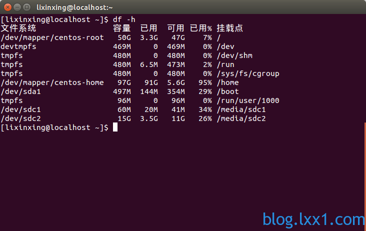 如果在Ubuntu环境下,SD卡会自动进行挂载,我们可以直接进行第2步。自动挂载的情况下,使用 df -h 命令可以查看SD卡,如下图中的/dev/sdb1 /dev/sdb2 就是树莓派的SD卡,其中60M的分区sdb1是boot分区,15G的分区sdb2是树莓派的系统文件分区。