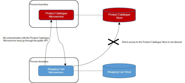一个微服务包含数据存储,在该进程中存储所需的数据,正是由于我们希望微服务的范围是一个完整的功能。大多数业务功能需要一些数据存储,例如对于产品目录微服务来说,每个产品的信息需要存储下来。为了保持产品目录微服务与其他微服务的松散耦合性,存储的产品信息数据完全包含在产品目录微服务之中。由产品目录微服务确定何时、如何存储产品信息。其他微服务——比如购物车微服务——只能通过产品目录微服务的接口来访问产品信息,而永远不能直接访问产品目录存储。
