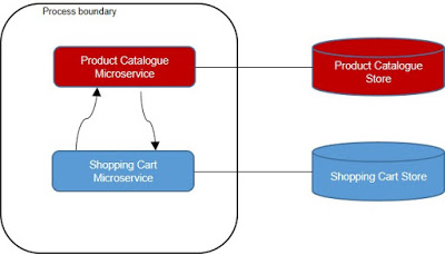 现在思考一下部署购物车微服务的新版本情况。要么得重新部署产品目录微服务,要么就得有某种动态代码加载功能,来替换正在运行中的购物车代码。前一个选项与微服务独立部署的原则完全相违背,后一个选项太过复杂而且起码有由于部署购物车微服务而造成产品目录微服务停机的风险。