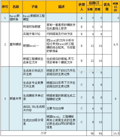 这一步是必须的. 让业务专家, 或者有经验的人给你把下关.这样对你的方案是一个很大的补充. 一个人的想法很难保证想的很全, 所以, 可以经过这个环节进一步充实你的方案.等这一步完成后, 你会形成项目列表. 就是针对每个开发功能, 拆解为详细的开发步骤, 并估算出工时, 如下图所示: