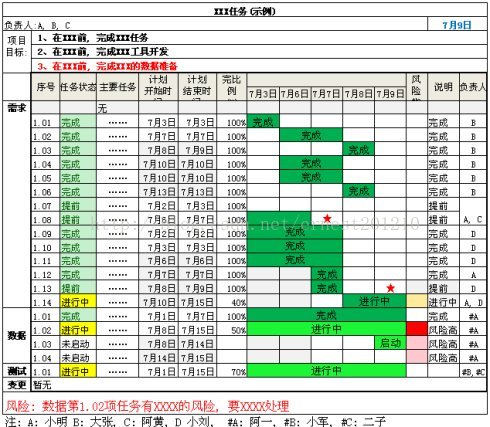 说到这不得不提下每日汇报的内容. 每日汇报, 就是把当前的工作内容以可视化的方式呈现出来. 有本书叫"一页纸项目管理", 里面介绍的方法就很好, 我又把它本地化了下, 显示的方式如下图所示: