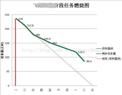 关于任务任务燃烧图, 他是从整体项目上对你当前产品的进度做出的评价, 有利于你及时调整项目中的瓶颈问题, 如下图所示的燃烧图: 他的做法就是总工时, 已剩余工时之前的关系来决定的.