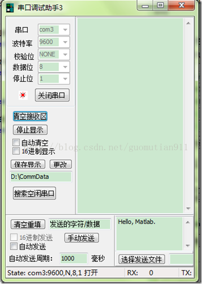 用串口调试助手回复matlab,点上图中的手动发送(发送的信息已英文句号.结束),matlab中收到信息