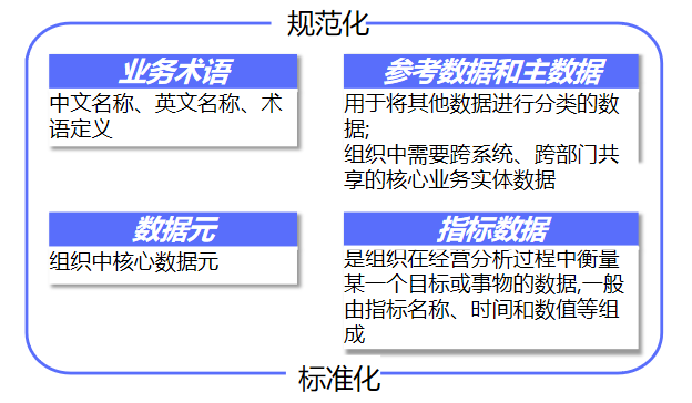 数据标准管理主要包括业务术语、参考数据和主数据、数据元、指标数据。数据标准管理的对象包括元数据标准、主数据标准、指标数据标准、数据质量标准、数据模型标准、数据接口标准、数据安全标准等。