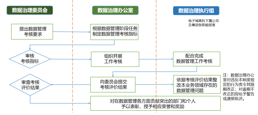 公平公正的年度考核与评价是确保数据管理工作长期高质量、高效率运行的重要保障。数据治理委员会提出考核要求,审核考核指标,审查评价结果;数据治理办公室制定考核指标,组织考核,提交评价结果;集团下属公司及各职能部室配合完成考核,根据评价结果整改问题。同时,应鼓励并表彰在数据管理各方面做出突出贡献的部门和个人,授予相应荣誉和奖励。