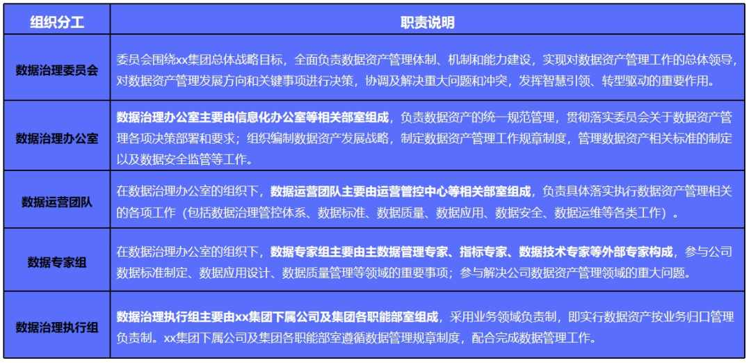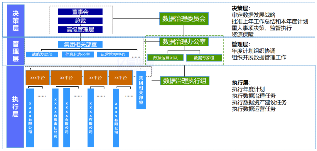 成立数据治理委员会,统一领导数据资产化建设和运营工作。数据治理委员会下设数据治理办公室,负责统筹组织实施。xx集团下属公司及集团各部职能部室即数据治理执行组配合完成数据管理工作。