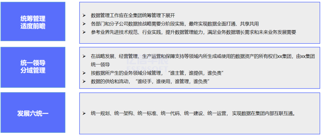 数据体系化管理是保障,数据标准化是基础,数据资产化、服务化、可视化是规划期内的目标,数据智能化是远期目标。
