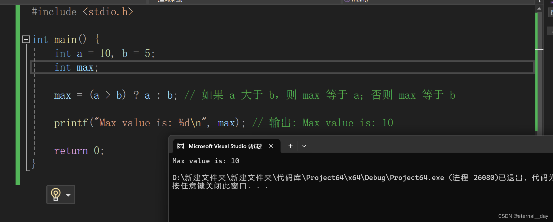 条件运算符是右结合性的,即从右向左进行结合。 条件运算符是一个表达式,因此它可以作为语句的一部分,也可以在赋值语句中使用。 条件运算符经常用于简单的条件分支,但不应该滥用,以免降低代码的可读性。