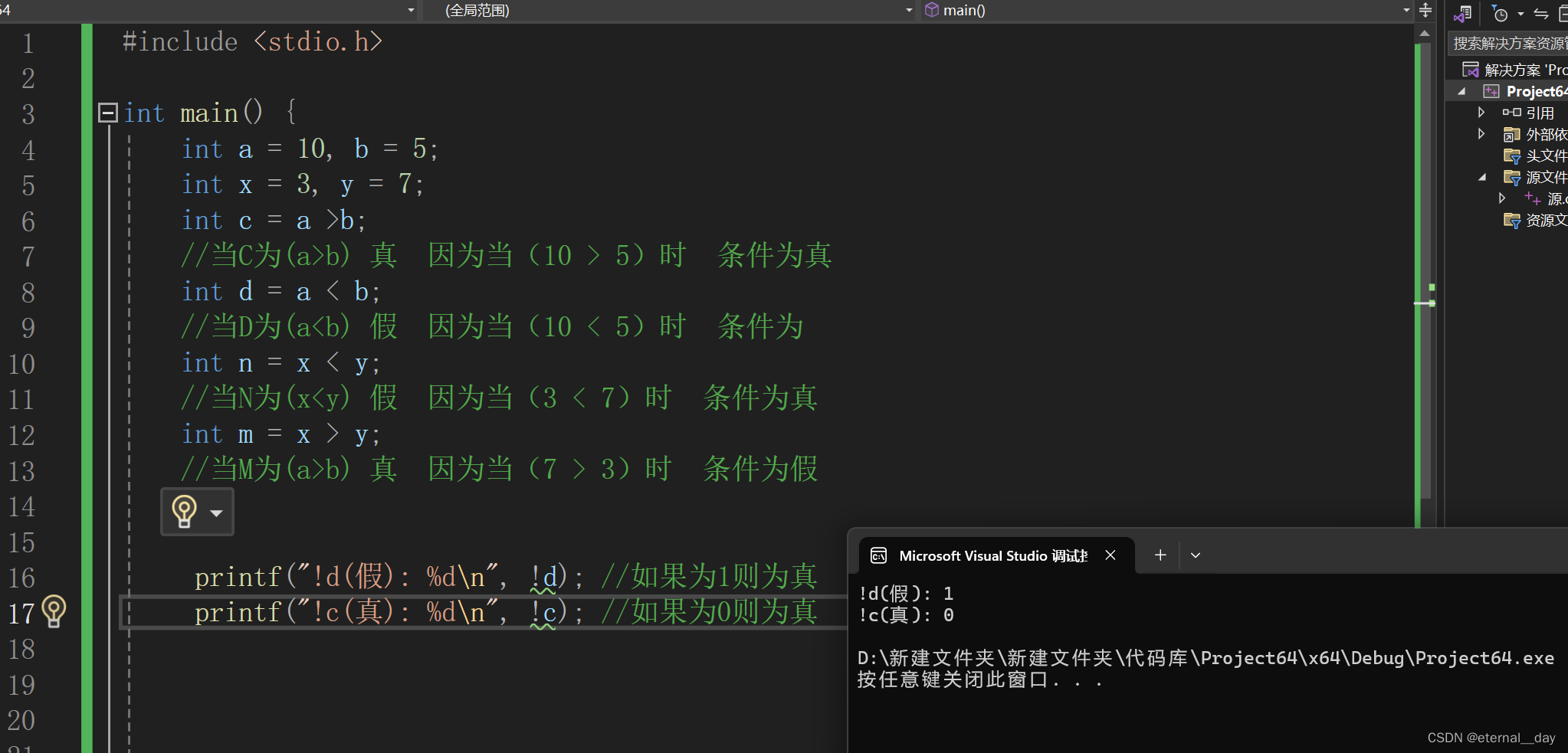 逻辑非运算符用于求取操作数的逻辑反。 如果操作数为真,则返回假(零);如果操作数为假,则返回真(非零)。 逻辑非运算符是单目运算符,只操作一个操作数。