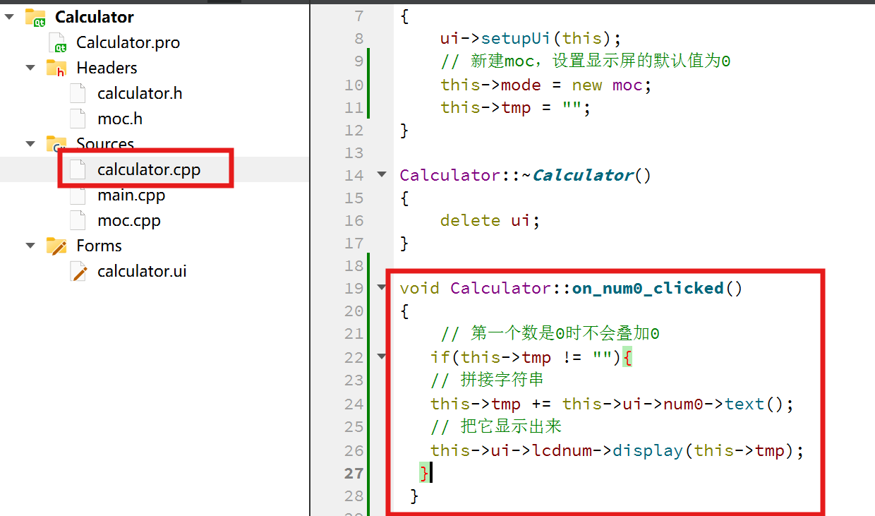 接下来,在“calculator.cpp”中,新建moc,并设置显示屏的默认值为0: