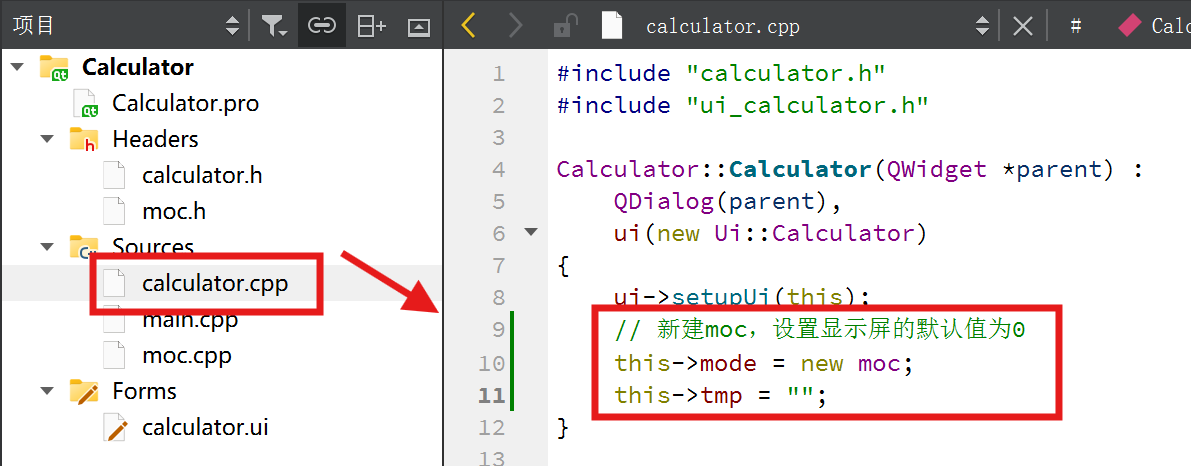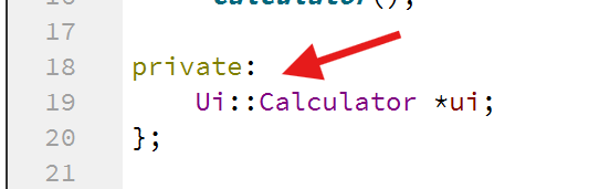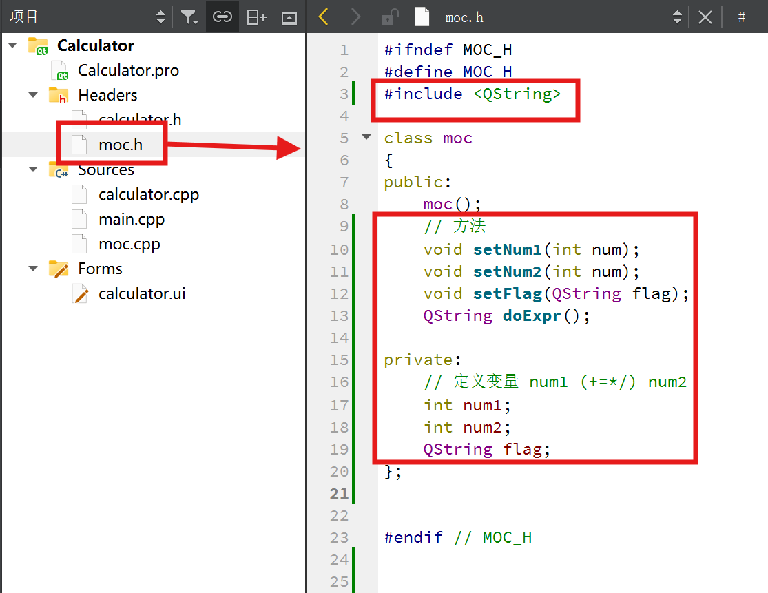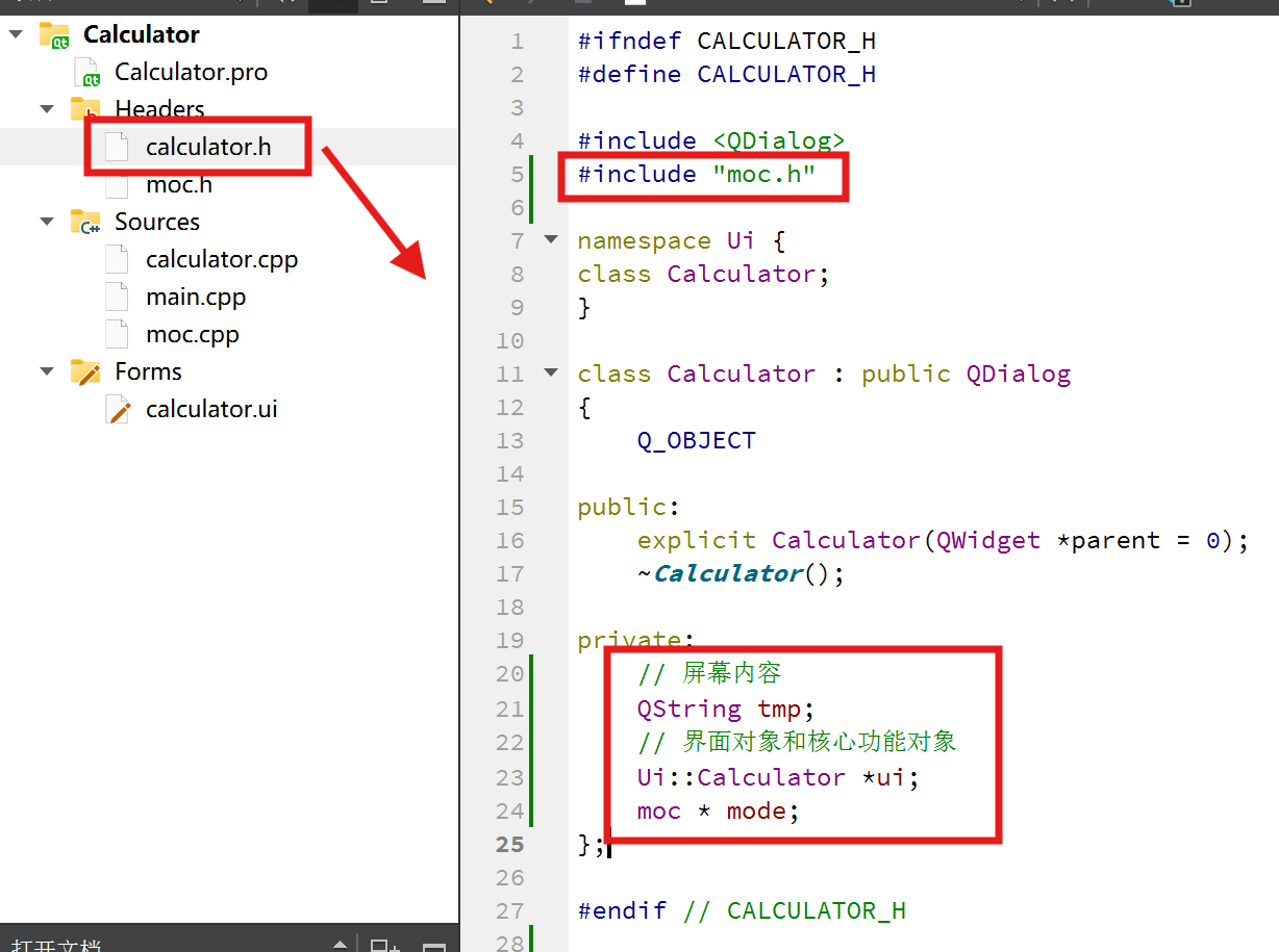 首先,找开calculator.h头文件,引入头文件moc.h,并找到其private位置,如下图,并进行相关的定义: