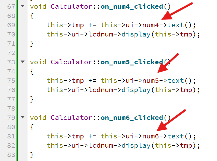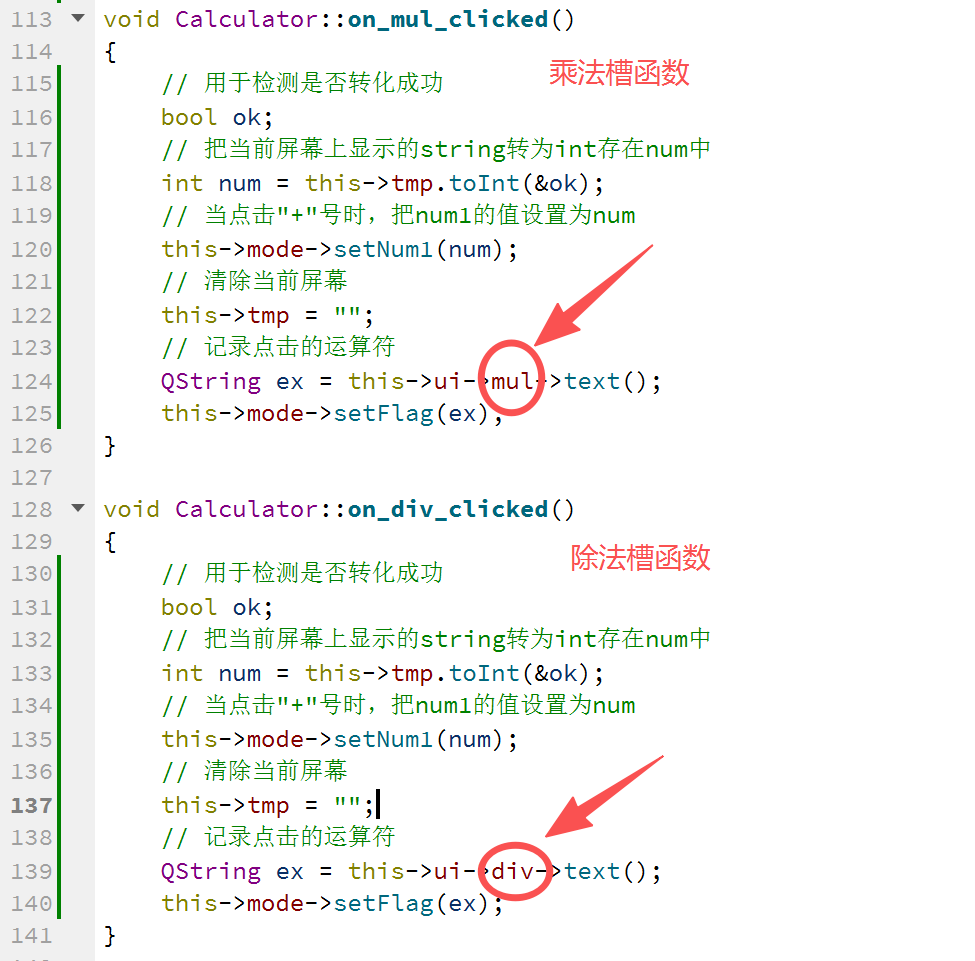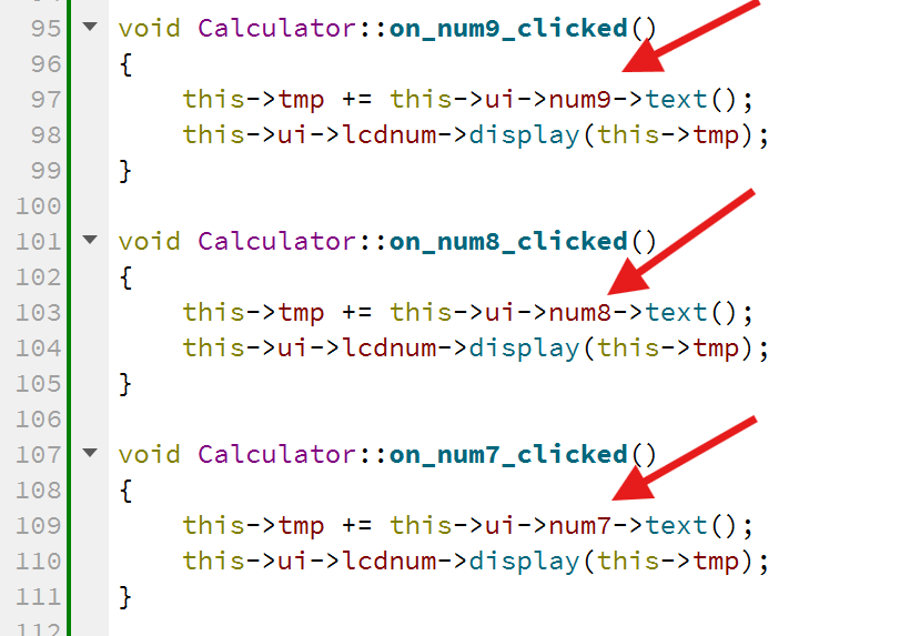 其它四则运算(- * /)的槽函数的定义方法类似,只是修改运算符对应的变量,具体操作如下图: